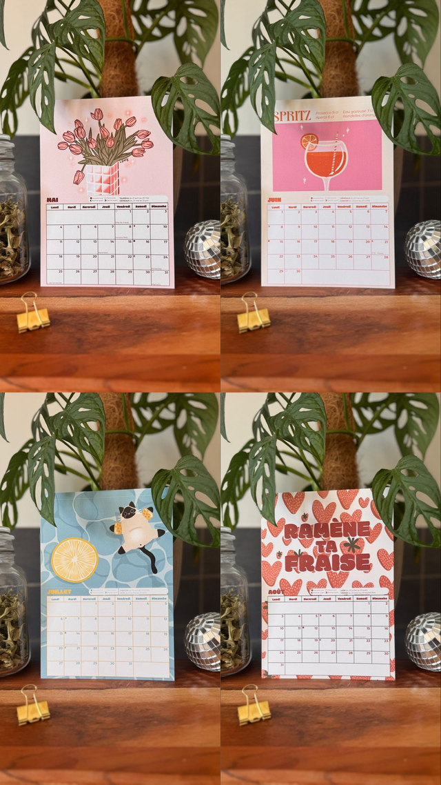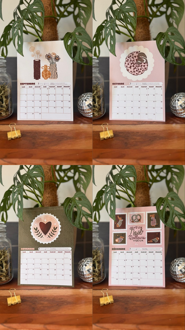 Calendrier mural format A5, composé de 12 cartes postales illustrées à découper (12 illustrations originales, réalisées sans IA).