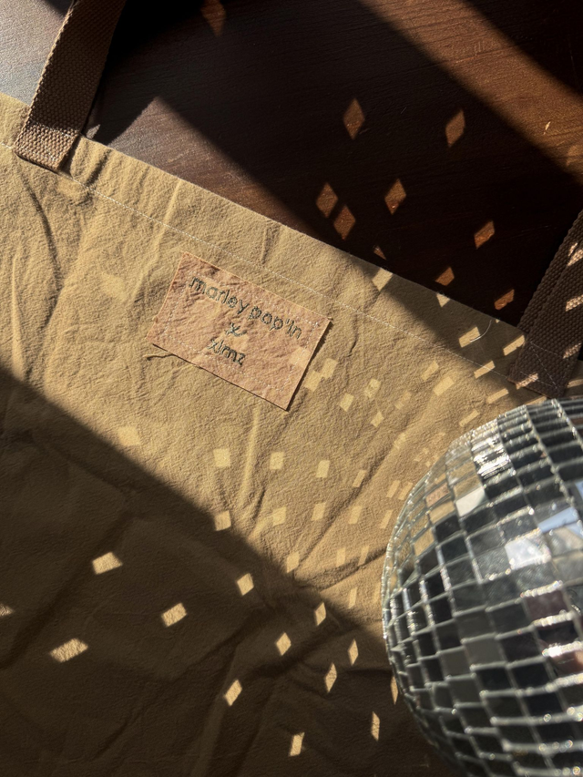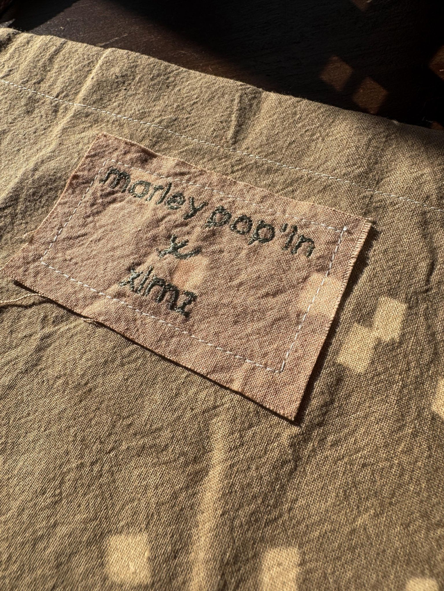 Toutes nos pièces sont réalisées à la main, de A à Z. Ce sont des pièces uniques teintées avec des éléments naturels (fanes de carottes, pelures d’oignons et noyaux et pelures d’avocat), imprimées à la main (linogravure et/ou sérigraphie) et cousues main.